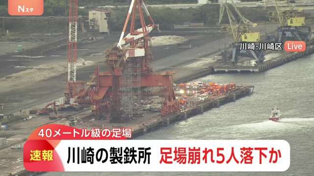 消防などによりますと、きょう午後4時半前、川崎市川崎区のJFEスチールの工場で「40メートル級の足場が崩れ、複数の人が落下しました。海上にも落ちてきている可能性があります」と119番通報がありました。