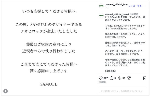 サミュエルは訃報に際し、インスタグラムを更新。「これまでナオヒロックを支えてくださった皆様へ、深く感謝申し上げます。今後の活動につきましては現在検討を進めており、内容が整い次第、改めてご案内させていただきます」と綴った。