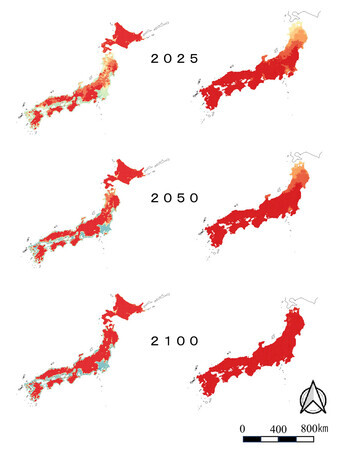 研究チームは、1978、2003、14年の分布データを基に、繁殖を伴う移動・分散能力や気候、土地利用などの要因を考慮したシミュレーションを実施。50年と2100年の分布状況を予測した。