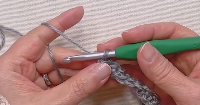 最初の目に細編みを1目編み、前段で作った鎖編みのスペースを確認します。その1段下にある「細編みの頭」に針を入れて長編みを編み、細編みの目にはそのまま細編みを編みます。最後の目は細編みになるので注意しましょう。