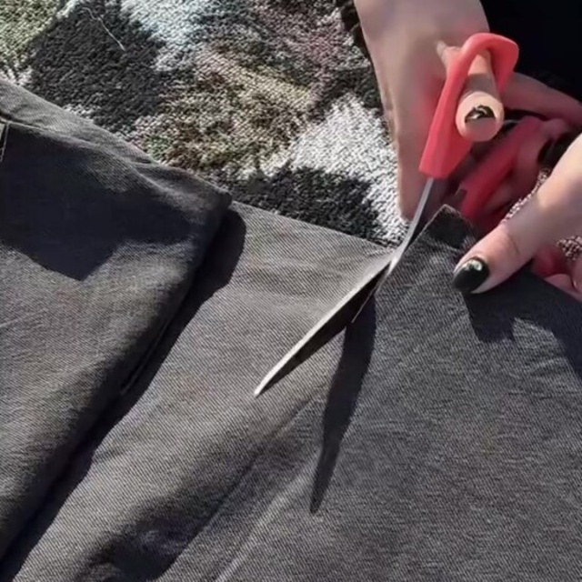 まずは、ブラックデニムの股下あたりにはさみを入れ、ザクザクとカット。さらにサイドのステッチに沿って切り進め、1枚の布のように広げていきます。もう履かないとはいえ、最初にはさみを入れる瞬間は緊張したとのこと。