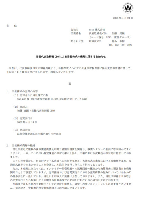 noteは4月23日、加藤貞顕CEOが自社株式55万株(発行済株式の約2.84%)を15日、市場内で売却したことを明らかにした。