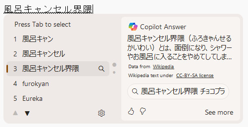 変換候補の一覧から「Copilot Search」による検索結果を直接見ることができ、Web検索までシームレスに行える。