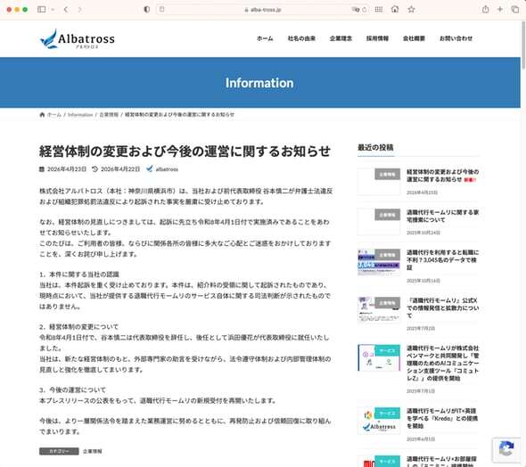 モームリを巡っては、2月3日に警視庁が創業者の谷本前代表らを弁護士法違反の疑いなどで逮捕。同月24日に東京地検が起訴していた。アルバトロスは営業時間を縮小し、新規の申し込み受付を停止していたが、3月末にモームリのWebサイトに浜田優花新代表の写真やあいさつが掲載され、一部で話題になっていた。