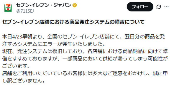 セブン-イレブン・ジャパンは4月23日、全国のセブン-イレブン店舗で同日早朝から、翌24日分の商品を発注するシステムにエラーが発生したと発表した。23日午後2時時点で復旧したが、影響を受けた最大約800店舗で、24日に一部の商品の供給が滞る可能性がある。